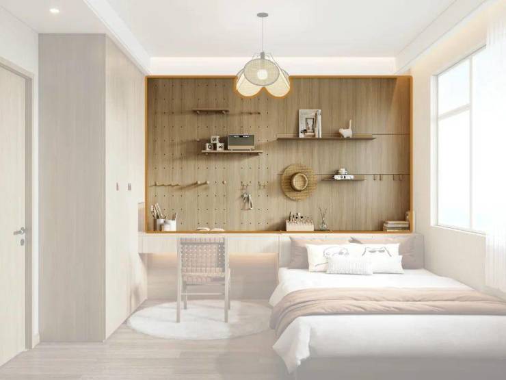 床头背景墙用木饰面打造洞洞板,安装多功能墙面家居、挂钩用于墙面收纳,更实用美观。