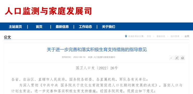 经国务院同意,国家卫生健康委、国家发展改革委等17部门印发《关于进一步完善和落实积极生育支持措施的指导意见》,要求加快建立积极生育支持政策体系,为推动实现适度生育水平、促进人口长期均衡发展提供有力支撑。