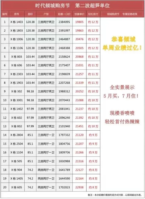 时代倾城将于周末推出20套一口价单位,涵盖建面约74㎡两房、85㎡/97㎡/98㎡/103㎡/120㎡三房户型,折后单价19805元/㎡起,总价约164万/套起,首付约8万起。(具体剩余货量和价格以案场实际情况为准)