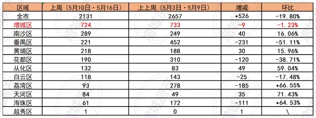 此外,从最近广州楼市成交数据来看,上周(5月10日-5月16日)广州一手住宅网签2131套,环比上上周下降19.8%。其中外围五郊区仍是成交主力,占全市网签量的73.02%。