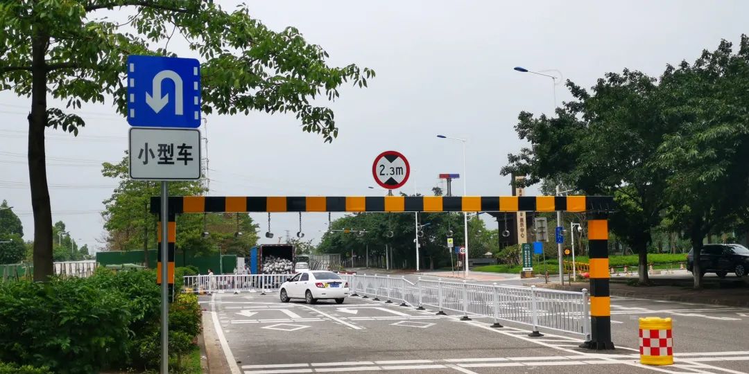 兴业大道西新设置的西往东小车掉头位在兴业大道与番禺大道交叉路口西侧的800米处,利用兴业大道西中央绿化带区域开设了一个掉头车道,安装了限高2.3米的龙门架,可同时容纳两台小车掉头,现场可以看到已有不少小汽车从该处掉头。