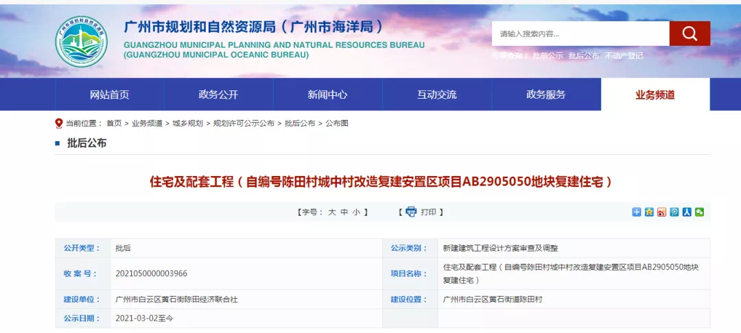 早在3月2日,广州市规划和自然资源局发布《住宅及配套工程(自编号陈田村城中村改造复建安置区项目AB2905050地块复建住宅)》,公布审批后的陈田村改造项目首期安置房设计方案。这预示着陈田村城中村改造项目的村民回迁安置即将进入兑现期。