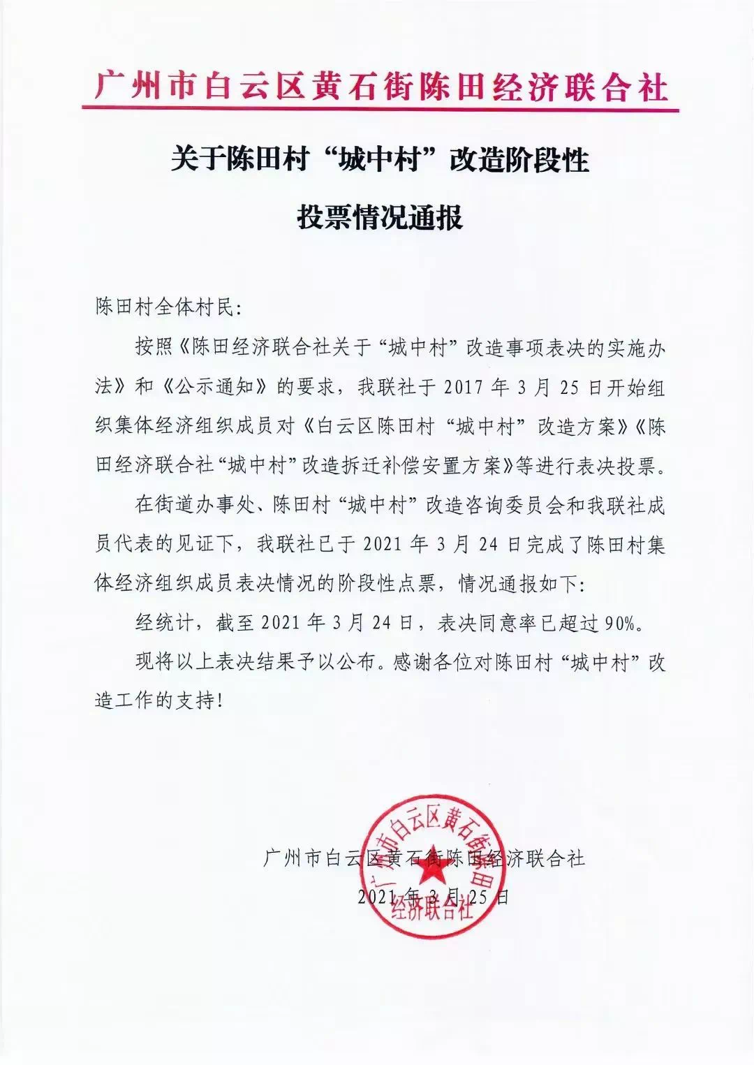 根据陈田经济联合社通报,截至3月29日,陈田村住宅房屋已累计拆除17.48万㎡;集体物业已接近100%签约率,集体物业累计拆除48.57万㎡,完成率接近9成。