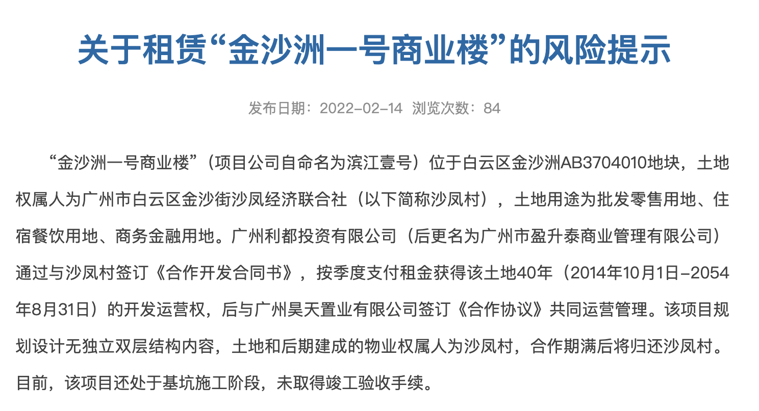 近日,白云区金沙洲一个商业项目被官方点名。据广州市白云区住房建设和交通局发布的《关于租赁“金沙洲一号商业楼”的风险提示》(以下简称《风险提示》),“金沙洲一号商业楼”(项目公司自命名为滨江壹号)土地权属人为广州市白云区金沙街沙凤经济联合社(以下简称沙凤村)。广州利都投资有限公司(后更名为广州市盈升泰商业管理有限公司)承租获得该土地开发运营权,后与广州昊天置业有限公司签订《合作协议》共同运营管理。