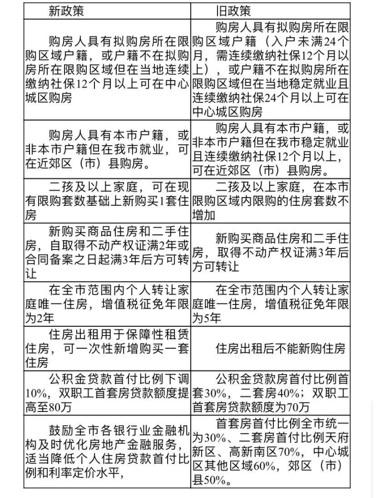 此外,鼓励支持全市各银行业金融机构及时优化房地产金融服务,适当降低个人住房贷款首付比例和利率定价水平,具体由四川省市场利率定价自律机制研究确定。此前,成都市执行的政策为:首套房首付比例全市统一为30%,二套房首付比例天府新区、高新南区70%,中心城区其他区域60%,郊区(市)县50%。