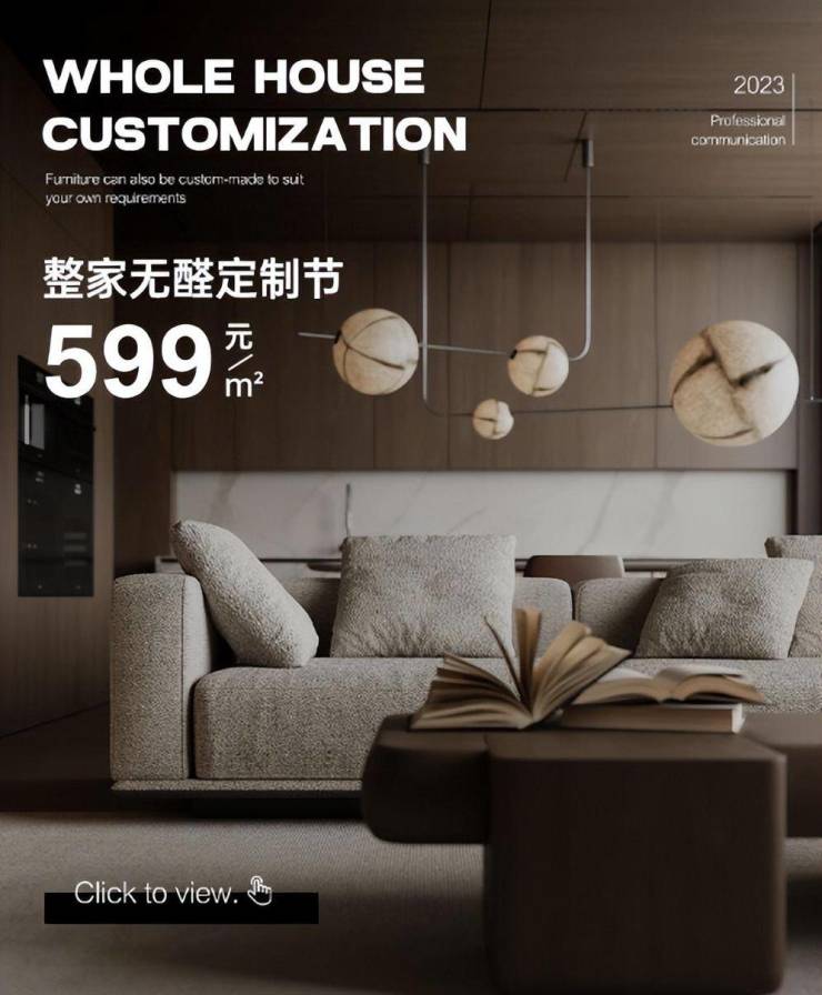 而在现在的599无醛定制节活动中,太子家居更是进行了极大的让利,不仅爆款家具商品可以优惠买到,还有不同优惠力度的全屋定制套餐,几乎以599元/㎡的价格就可以实现精品全屋定制,还能获得家具、家电、软装、灯具等各种家居好礼。