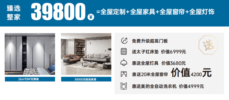 以39800元甄选整家套餐为例,其中包含价值30000元的成品家居,还会赠送全屋窗帘与全屋灯饰,全屋定制服务的ENF无醛板达到26㎡,并可免费升级超高门板,一个套餐就能让你省心装全家。