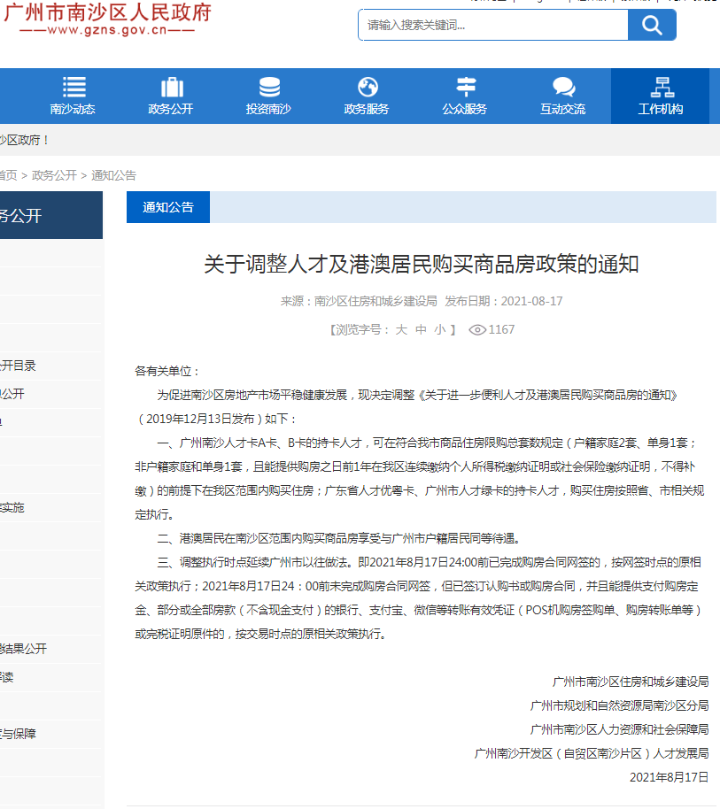 《通知》指出,港澳居民在南沙区范围内购买商品房享受与广州市户籍居民同等待遇。调整执行时点延续广州市以往做法。即2021年8月17日24:00前已完成购房合同网签的,按网签时点的原相关政策执行;2021年8月17日24:00前未完成购房合同网签,但已签订认购书或购房合同,并且能提供支付购房定金、部分或全部房款(不含现金支付)的银行、支付宝、微信等转账有效凭证(POS机购房签购单、购房转账单等)或完税证明原件的,按交易时点的原相关政策执行。