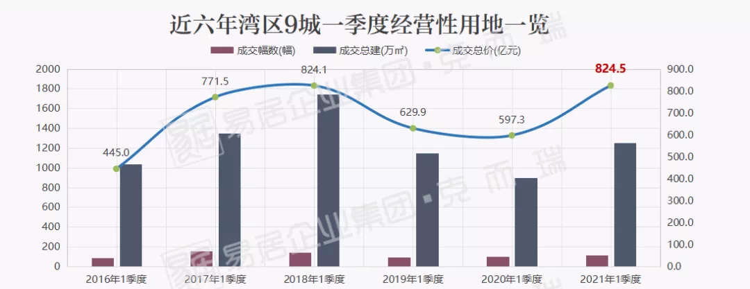 据克而瑞统计,2021年一季度湾区9城通过招拍挂方式的经营性用地合计供应176宗,成交114宗,成交总建达1253.41万平,最终吸金824.5亿元,同比去年一季度上涨38%。
