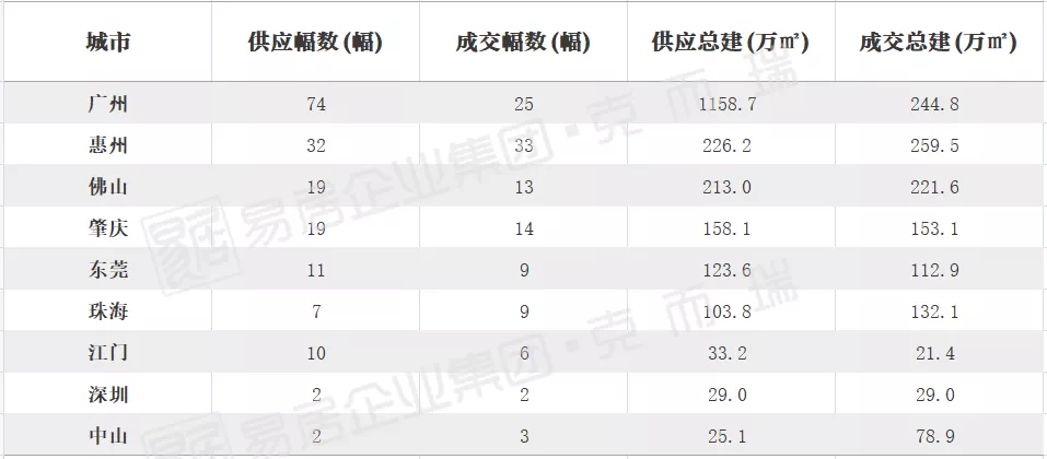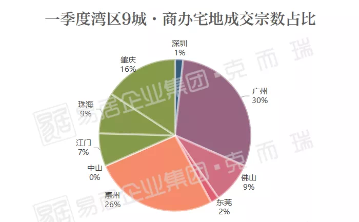 至于商办地方面,广州成交了17宗地,是商办地成交排名前列名;惠州则成交了15宗,仅次于广州;肇庆成交了9宗,排在第三;其余城市成交宗数在1-5宗左右,仅中山无商办地成交。