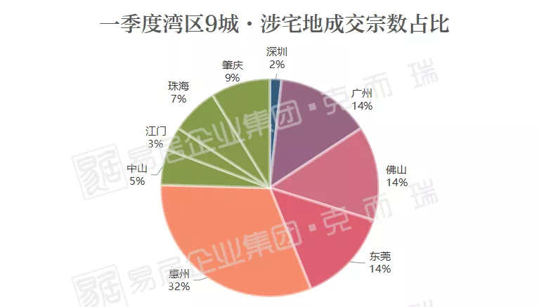 统计显示,一季度惠州涉宅地成交幅数最多,共计成交18宗,占全部涉宅用地的32%,受房企热衷程度不言而喻;其次为广州、佛山、东莞并列,成交了8宗涉宅地;其余如中山、江门、珠海及深圳等5城,成交的涉宅用地均在1-5宗左右。