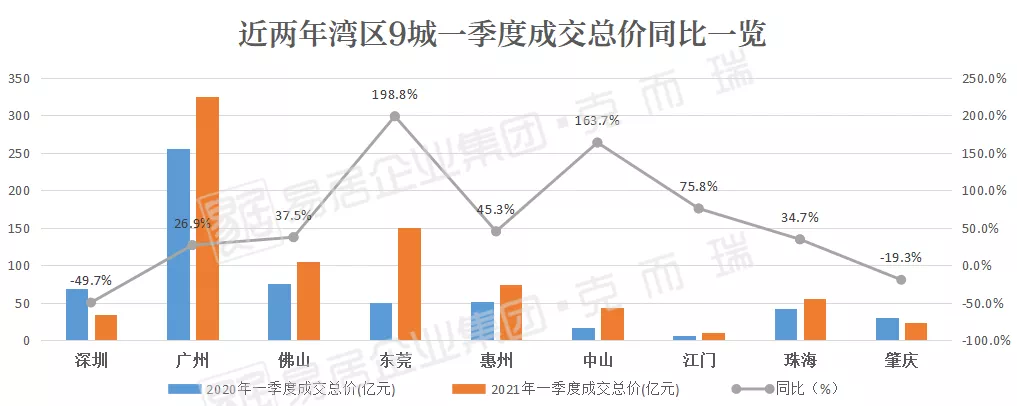 对比近两年2020-2021一季度湾区9城的土地成交情况,成交总价同比涨幅较大的是东莞,涨幅达到了198.8%,看来房企们对东莞市土地开发的钟爱程度大涨了不少;其次,是供不应求的中山市,同比去年一季度成交总价涨幅达163.7%。