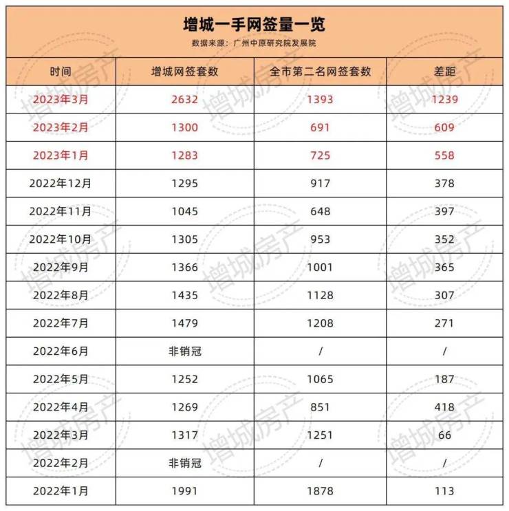 从中原数据来看,2023年,增城的网签量和排名第二的区域,都拉开了超500套的距离,3月份差距更是高达1239套。