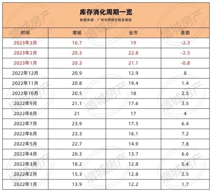 但是,2023年这3个月以来,增城的库存消化周期均低于全市水平,特别是3月份,去化周期为16.7个月,位居全市第六。