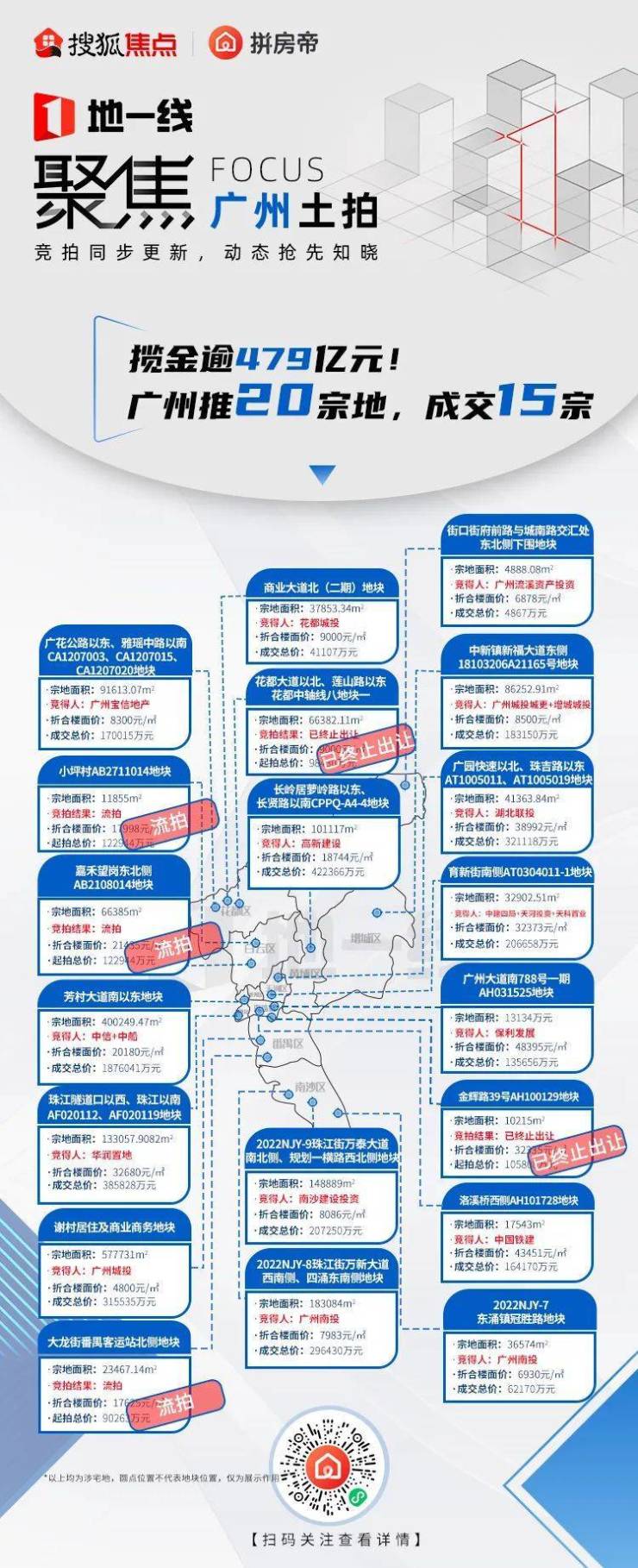20宗地中,2宗地提前宣告终止出让,3宗地流拍,13宗地底价成交,2宗地溢价成交,总成交金额逾479亿元。