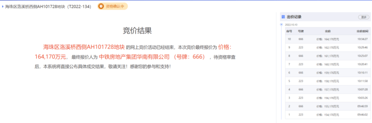 洛溪桥西侧AH101728地块起拍总价154170万元,经过10轮竞价后,最终为中铁房地产集团华南有限公司拿下,成交总价164170万元,折合楼面价43451元/㎡。
