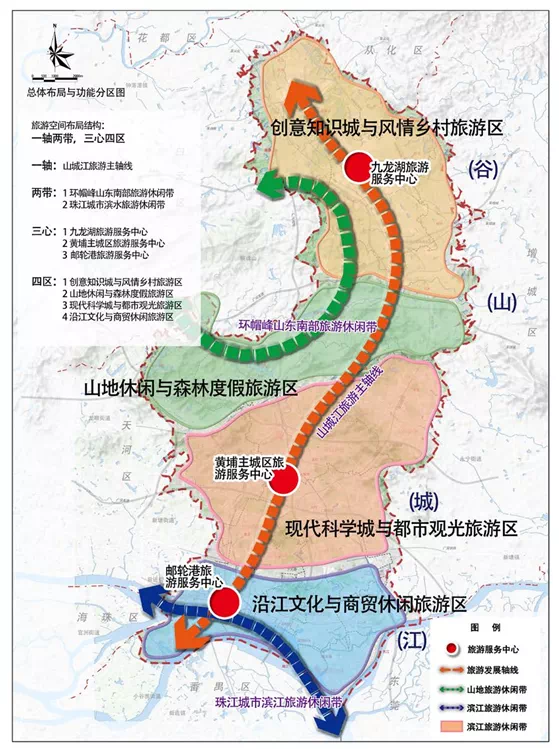 《专项规划》提出,围绕黄埔区构建“一岸双轴三片”空间发展格局和全面提升四区四中心创新发展能级的总体布局,构建“一走廊、五片区、一网络”的文化和旅游发展布局。