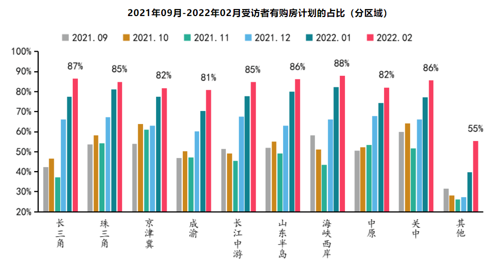 从各能级城市购房意愿来看,一线购房意愿居首,三四线购房意愿涨幅较大,长三角购房意愿强烈,关中地区购房意愿明显改善,京津冀置业意愿相对较低。2月长三角地区有59%受访者购房意愿强于上个月,京津冀地区购房者意愿相较于上个月减弱的占比高达19%,市场仍存一定观望情绪。但伴随贷款利率下降,近期北京楼市已逐步启动,或将带动环京地区市场升温。
