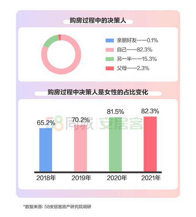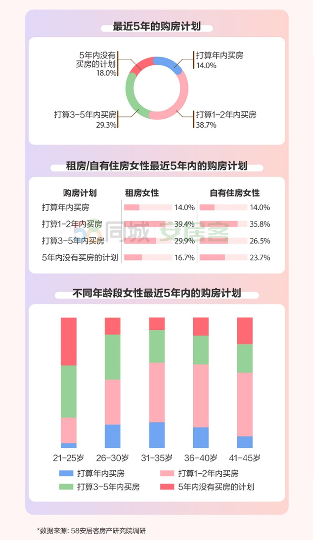 58同城、安居客《2021年女性置业报告》调查显示,有82%的女性计划在5年内置业,其中打算今年买房的女性占比14%,近四成女性打算两年内买房,其中计划5年内购房的租房女性人数占比要高于自有住房女性。