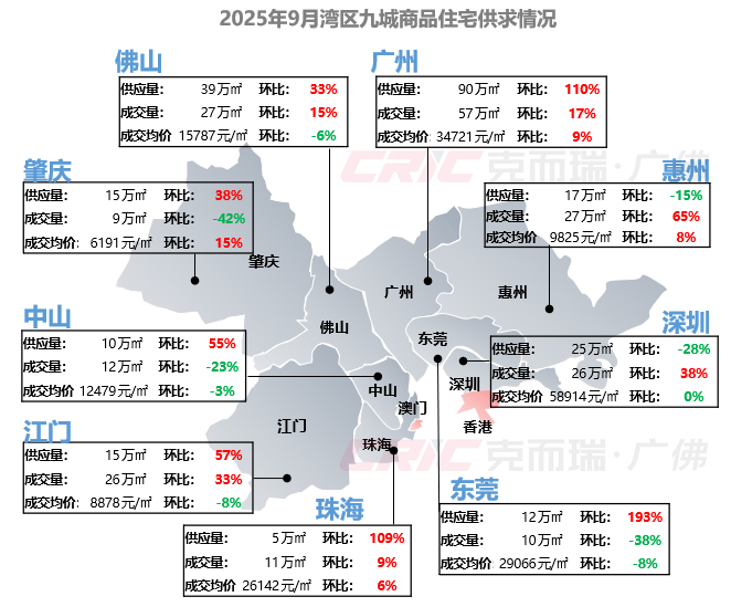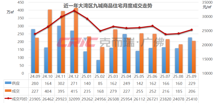 至此,克而瑞数据监测显示,2025年前三季度度湾区九城商品住宅成交181234套,较去年同时期减少5%。