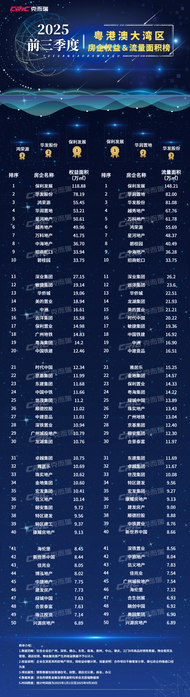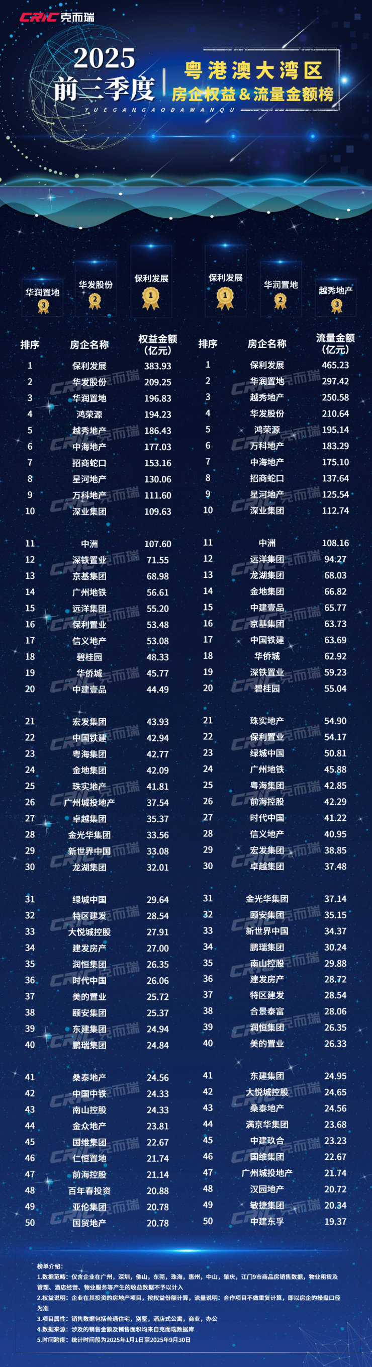 TOP50房企揽金超三千亿,11家百亿房企 2025前三季度大湾区房企销售榜发布
