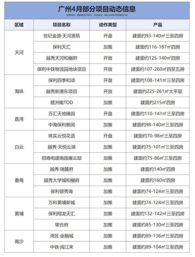 据搜狐焦点、中地行初步统计,4月广州预计约20个盘有动作,覆盖天河、海珠、荔湾、白云、番禺、黄埔、南沙六区。