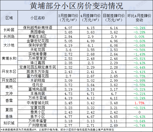据近期媒体不完全统计,4月黄埔23个标杆小区中,共计有21个小区二手房源挂牌价环比下滑。