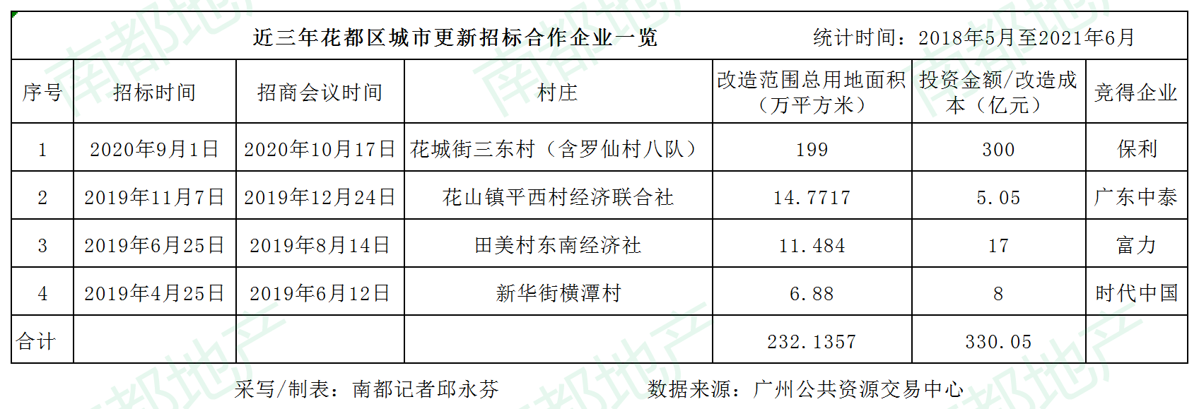花都区一共已有4条城中村公开招标到合作企业。除了花城街三东村(含罗仙村八队)的改造范围接近200万平方米,其余三条村的改造范围都相对“迷你”。四条村的改造投资总额约为330亿元。
