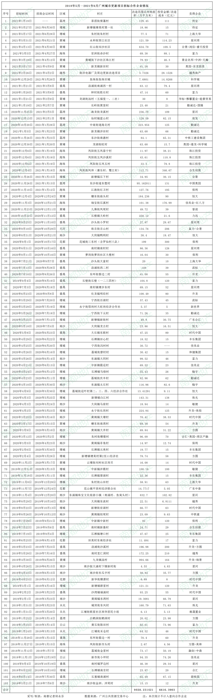 南都大数据研究院统计发现,自2018年5月以来截至2021年6月这三年,广州已有103条城中村(含一厂一旧城改造)正式公开招标合作企业。改造范围用地面积高达9450.23万平方米,相当于4.5座白云山,或15.3个珠江新城的占地那么大。