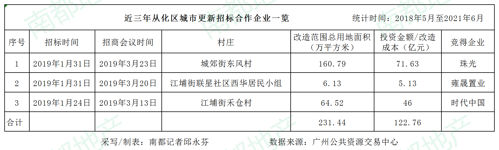 从化区的城中村改造公开招标主要集中在2019年1月。彼时江埔街禾仓村、联星社区西华居民小组,及城郊街东风村三条村先后开启招标。三条村改造范围231.4万平方米,投资金额122.76亿元。