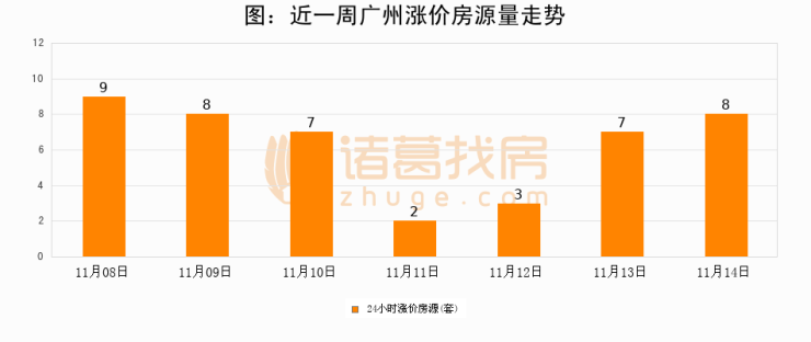 根据诸葛找房数据显示,广州24小时涨价房源量为8套,较11月13日增加1套,环比上涨14.3%。与此同时,涨价房源占比小幅扩大,业主信心有所提升。