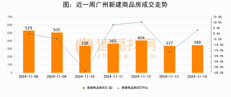 根据广州市住房和城乡建设局数据显示,2024年11月14日广州新建商品房成交348套,较昨日增加11套,环比上涨3.3%