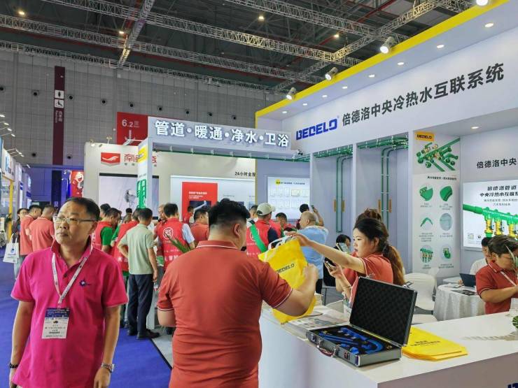 以管道、暖通、净水、卫浴四大系统产品为核心的倍德洛管道展台位于6.2H385,其管道模型和技术优势在展会上一览无余。在众多展会品牌中,倍德洛展台前人头攒动,在场宾客围绕着倍德洛的产品特色聚精会神地交流讨论着,整个现场十分热闹。