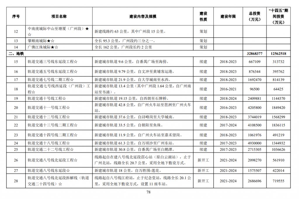 1. 续建项目:穗深城际(新塘经白云机场至广州北站段)、广佛环线广州南站至白云机场段、广佛环线佛山西站至广州南站段(广州段)、佛莞城际广州南站至望洪站段(广州段)、穗深城际琶洲支线、广清城际二期(广州北至广州段)等。