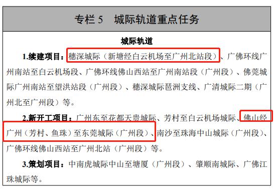 2. 新开工项目:广州东至花都天贵城际、芳村至白云机场城际、佛山经广州(芳村、鱼珠)至东莞城际(广州段)、南沙至珠海中山城际(广州段)、广佛环线佛山西站至广州北站(广州段)等。