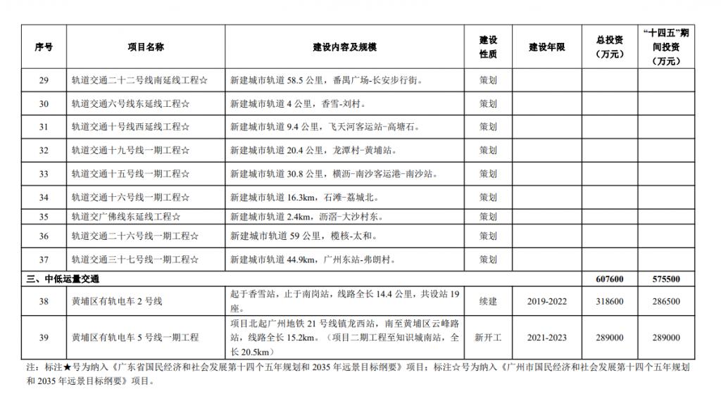 在城市轨道交通方面,广州十四五期间预计将多条地铁线路,策划线路包括 22 号线南延段、6 号线东延段、10 号线西延段、19 号线一期、15 号线一期、16 号线一期、广佛线东延线、26 号线一期、37 号线一期。