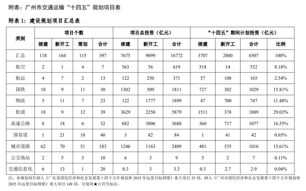 根据规划显示,十四五期间,广州在交通方面,预计将投资 6507 亿,新增建设项目近 164 个,续建项目 118 个。