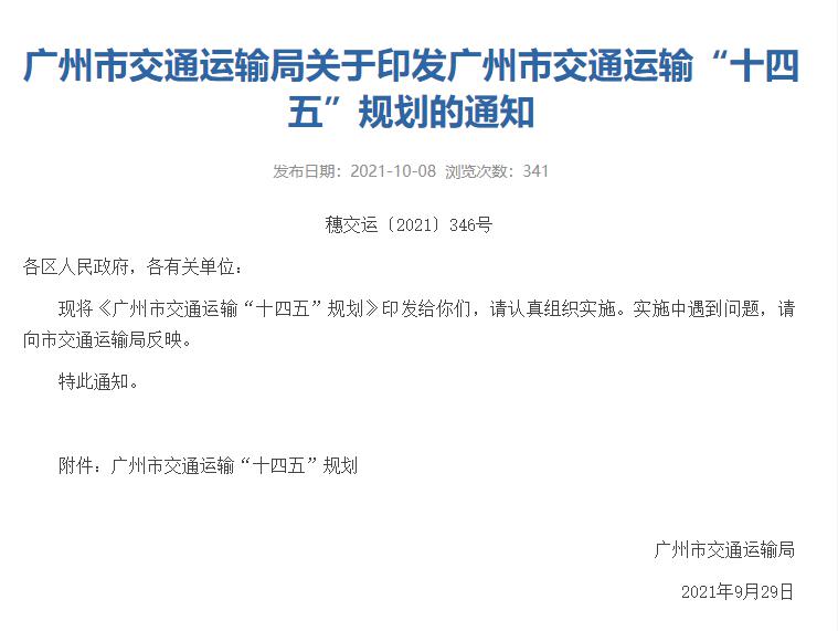 10 月 8 日,广州交通局正式印发广州市交通运输 " 十四五 " 规划。