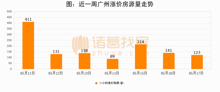 根据诸葛找房数据显示,广州24小时涨价房源量为123套,较05月16日减少18套,环比下降12.8%。与此同时,涨价房源占比小幅回落,对于购房者来说是一个入市窗口期,购房者可抓住时机入市。