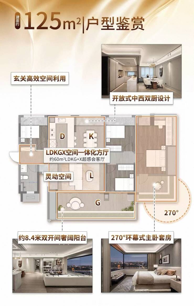 125㎡峯璟户型则以更阔绰的尺度与更全能的配置,为层峯人群打造专属的高定生活空间。约60㎡的LDKG+X多元方厅,将空间的可能性发挥到极致,无论是亲友聚会、亲子互动,还是居家办公,空间皆能自由切换,满足不同场景下的生活需求。百变的X空间更是创意的孵化地,可根据主人的兴趣爱好改造成收藏室、画室、茶室等,让生活的灵感从不设限。中西双厨设计,烟火气与社交力并存,美味无界融合,烹饪不再是家务,而是一场生活的艺术。