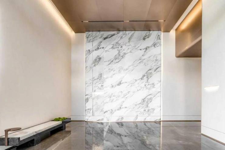 项目随处可见采用“奢石、奢板、奢镜、奢金、奢玉”等高端材质打造的品质细节,如外立面采用大面积玻璃幕墙,结合流线型铝合金线条,并运用高难度的圆弧转角工艺,在彰显卓越质感的同时,也为城市景观注入灵动的光影韵律;公共空间融入高奢酒店设计理念,石材与金属饰面的艺术搭配,营造奢雅格调;车库采用穿孔铝板及定制型材,与灯光艺术相映成趣,品质堪比五星级酒店……