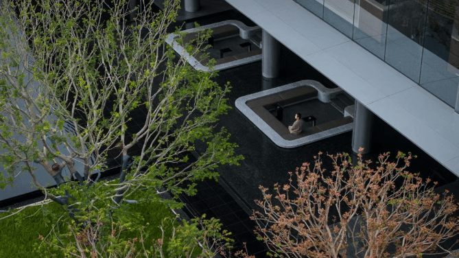 架空层的景观设计,还巧妙构建“家以外的第二客厅”,通过全龄化社交空间设计,实现健身康体、户外办公、茶叙休闲等场景的自由切换。