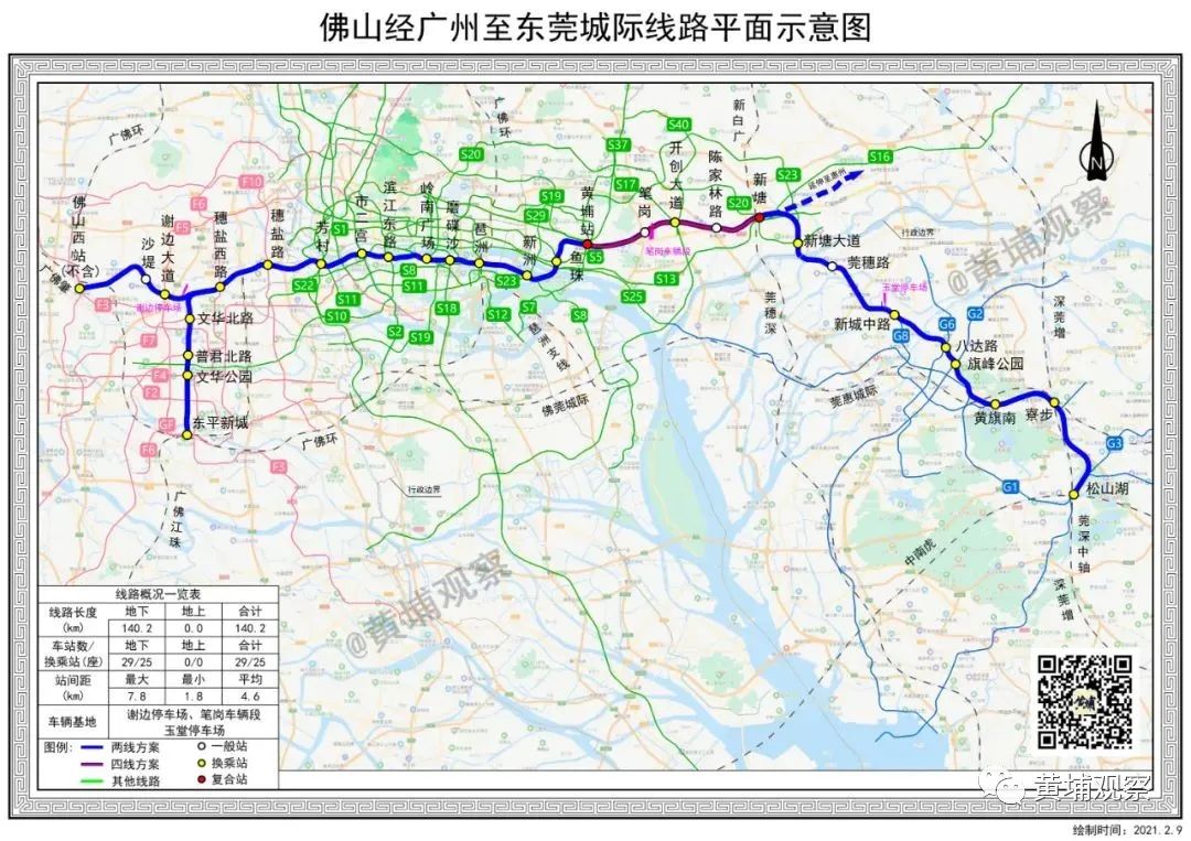 上面这张地铁28号线示意图,最近首次在黄埔观察VIP付费微信群曝光后,已被一些人转出,并在一些公众号上流传。对于重要的干货,一般我们是不急的,让子弹飞一会再说。我们对于流量,不是特别饥渴,更侧重于沉淀有价值的东西。考虑到28号线黄埔段几个站点,特别是经云埔的两个站,周边均为工业区,并未有楼盘——周边楼盘中,最近的爱特城也要2-2.5公里,中海誉城将近4公里,中央城3公里左右,富力悦禧约2.2公里,富力新城约3.2公里。几个楼盘都不在正常步行通勤范围,影响有限,所以我们决定说一说。我们手上还有更为详细的线路图,可以清晰看到设站具体位置和出入口,就先不公开了。上面这张图已经够用了。上面的28号线示意图,标明的制图时间为2021年2月9日。如不出意外,这大致是较新的图了,应该不会大改了,即便局部微调,也不影响整个线路的走向,甚至站点设置了。较新线路图显示,28号线全长140公里,全为地下线,全程设站29座,其中换乘站25座,较大站间距7.8公里,最小1.8公里(主要为佛山市区和广州市区段),平均站间距4.6公里,设计时速160公里/小时。01较新版本四处重大调整对比今年稍早前网传的如下版本(下图),较新版本做了以下调整: