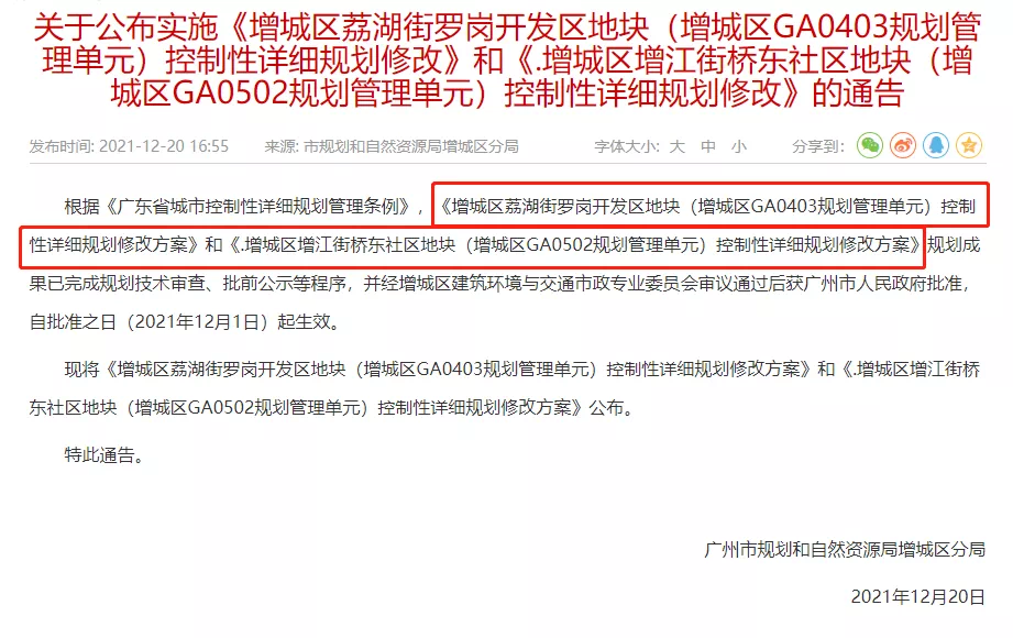 近日,市规划和自然资源局增城区分局公布了《增城区荔湖街罗岗开发区地块(增城区GA0403规划管理单元)控制性详细规划修改方案》和《增城区增江街桥东社区地块(增城区GA0502规划管理单元)控制性详细规划修改方案》规划,下面一起来看看。