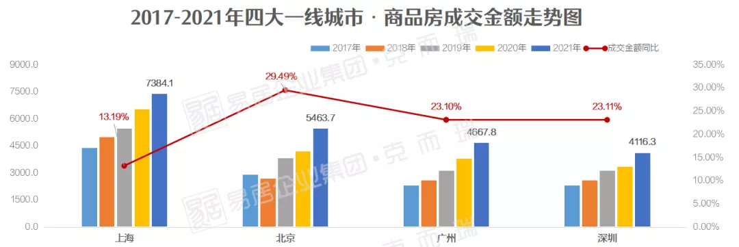 常年占据中国前四排名的,显而易见是四大一线城市;克而瑞数据显示,四个城市2021年商品房成交金额较低都超四千亿元规模。