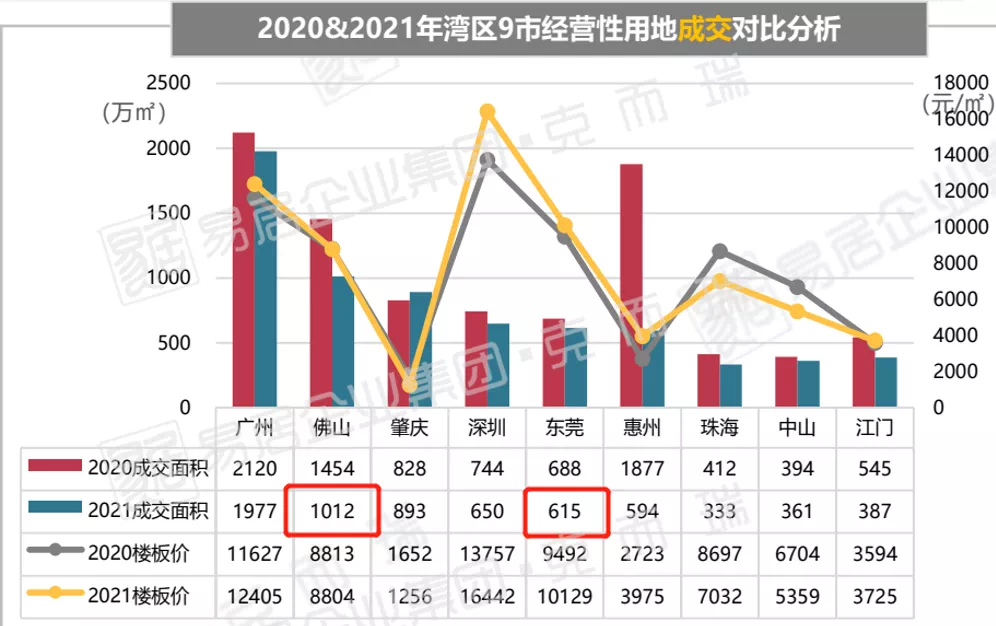 除此之外,昨日东莞市统计局公布了2021年东莞经济运行情况,根据广东省地区生产总值统一核算结果,2021年全年东莞地区生产总值为10855.35亿元,同比增长8.2%,两年平均增长4.6%。由此,东莞成为全国第24个、广东第4个万亿GDP城市。对于东莞(近深圳)、佛山(近广州),这两座相继进入万亿GDP俱乐部的城市,其命运又何其相似?据七普人口调查数据显示,东莞市以常住人口1046.6万人,比佛山市常住人口949.8万人多出约百万人口。虽说东莞市常住人口更多,不过由于地块限制、或新房售价等问题,佛山市土市和楼市揽金更好。由克而瑞2021年湾区九城楼市年报披露,上一年佛山土市成交出让1012万㎡经营性用地,东莞仅成交出让615万㎡经营性用地;