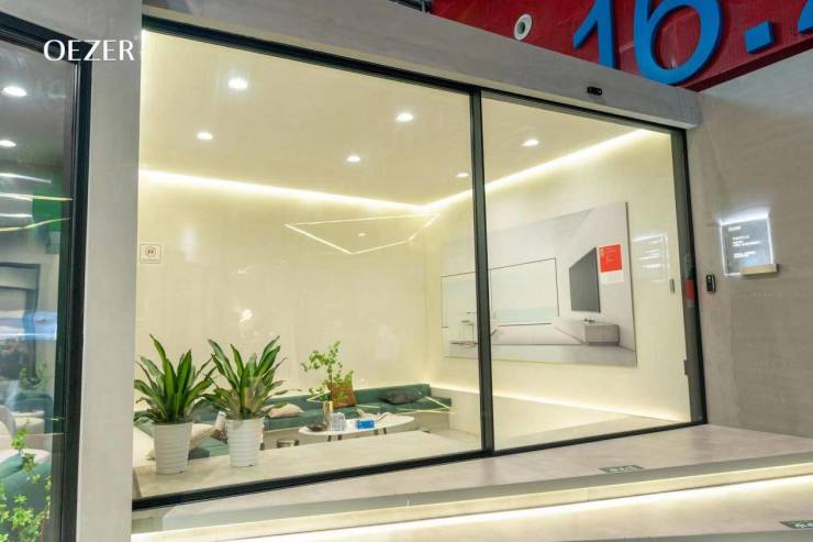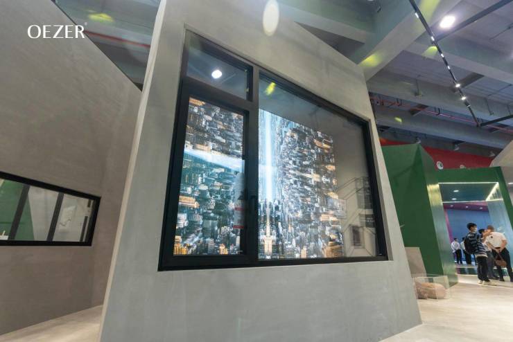 展台有欧哲今年重磅推出的天幕智能全景窗,是以适配高端美景奢宅为定位,为高净值家庭提供全景大视野体验。这款产品较大的特点就是高科技、智能化、大视野,同时兼顾安全性。一方面采用了进口工业级驱控系统实现智能启闭、智能雨感、智能防夹;一方面以窄边、隐扇设计实现全景效果,营造DMAX般的视野冲击,展现艺术与科技碰撞的魅力。
