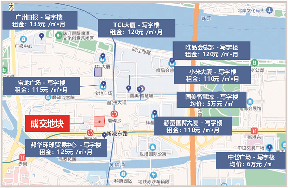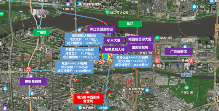 地块位于琶洲西区,1公里范围内囊括有海珠有轨电车、地铁3、8、18号线及在建的11、12号线,交通通达性极高。区位优势显著,板块内商办氛围浓厚,地块周边已进驻有复星、唯品会、腾讯、TCL等百强企业。