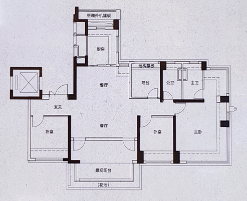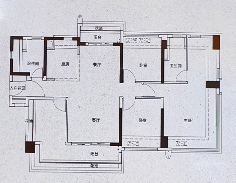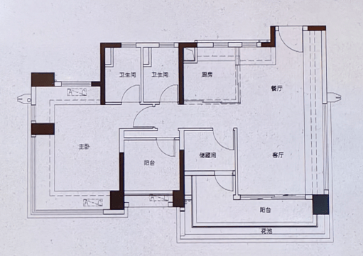 如建面约90㎡户型,可做到三房两卫。大飘窗、花池、阳台等可拓展空间,不仅实用率高,而且空间可塑性性强。厅卧之间没有承重墙,若彼此打通,可直接扩大客厅尺度,可容纳更多的亲朋好友聚会或打造成多功能亲子娱乐空间。