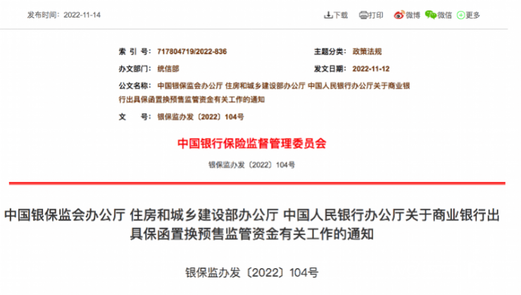 近日,中国银保监会办公厅、住房和城乡建设部办公厅、人民银行办公厅联合印发了《关于商业银行出具保函置换预售监管资金有关工作的通知》(以下简称《通知》),允许商业银行在充分评估房地产企业信用风险、财务状况、声誉风险等的基础上进行自主决策,与优质房地产企业开展保函置换预售监管资金业务。